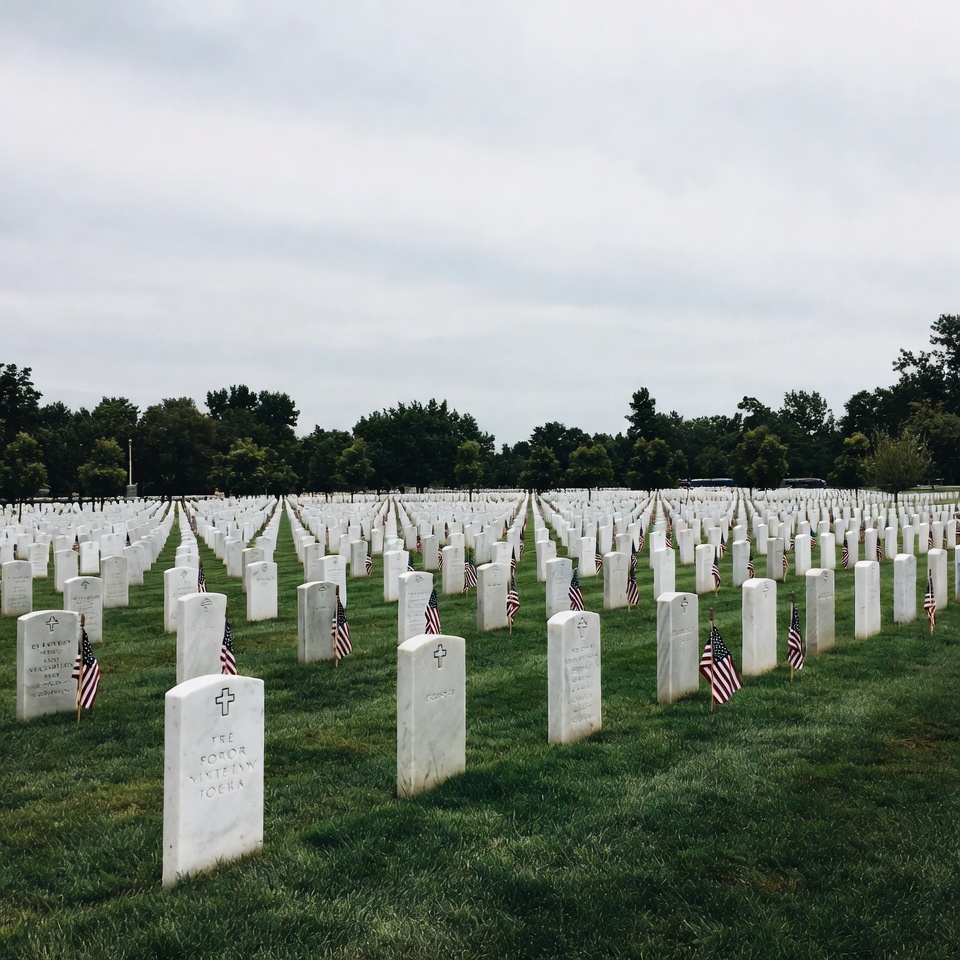 American flags, Arlington cemetery, burial ground, cloudy sky, crosses, engraved stones, flagpole, flags, grass, gravestones, headstones, lawn, memorial, military graves, overcast, rows, tombstones, trees, veterans, white stones, cemetery
