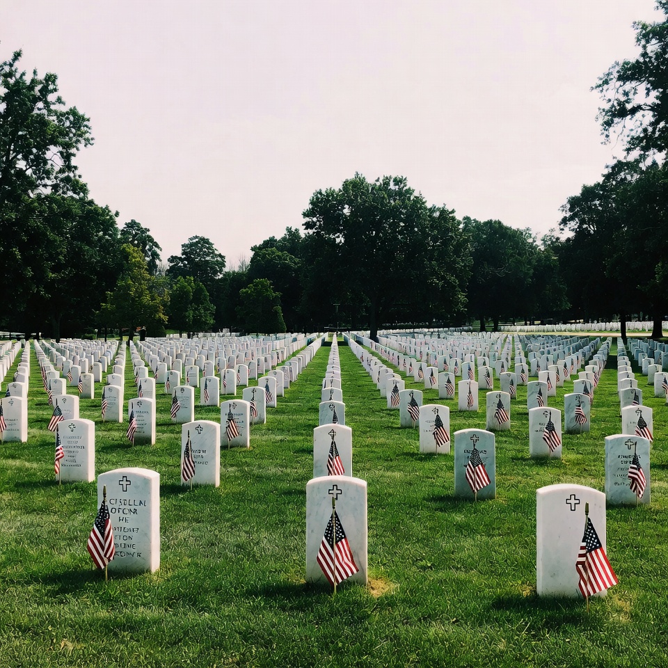 Rows of white gravestones fill a vast military cemetery under a clear sky. Small American flags are placed in front of each headstone on the green grass. Tall trees frame the solemn scene in the background.