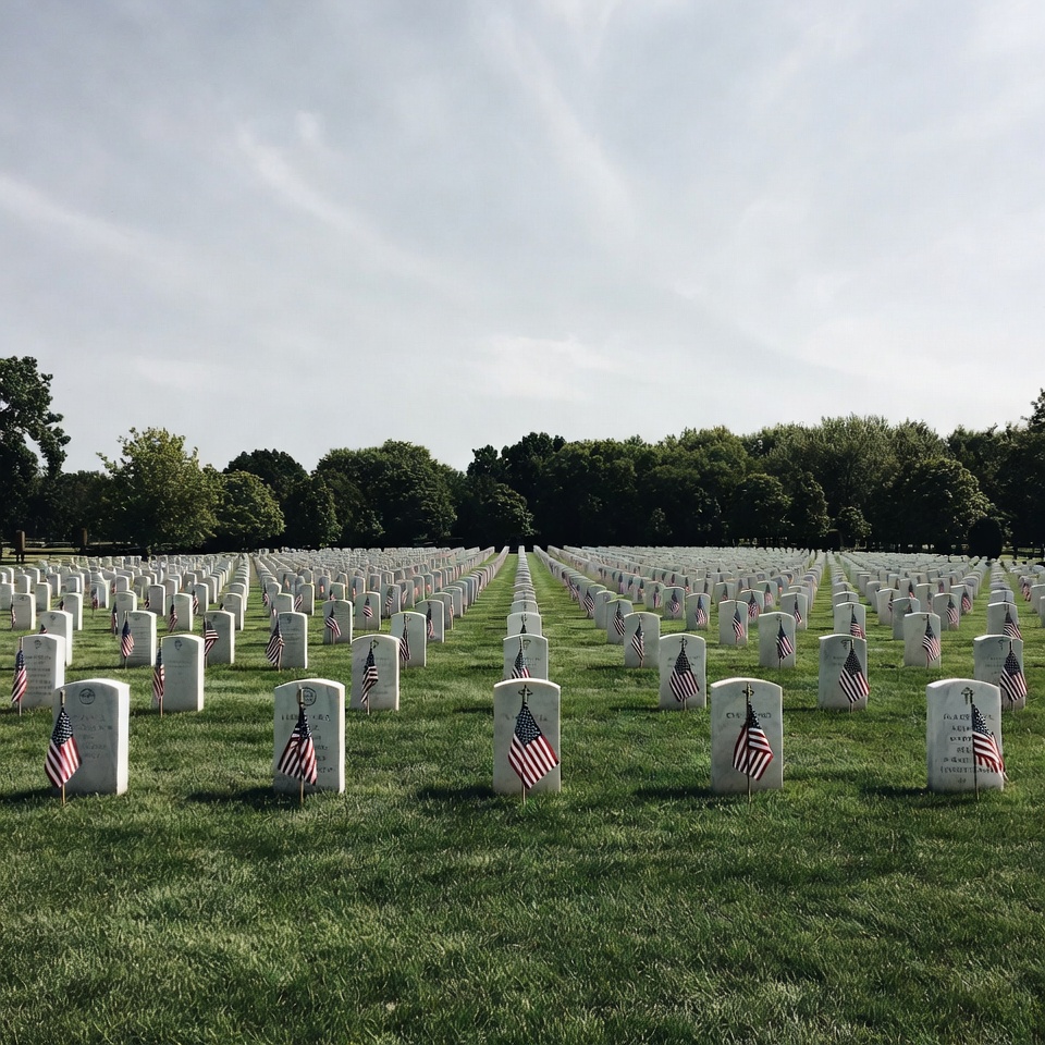 Rows of white gravestones covered in green grass fill a cemetery under a cloudy sky. Small American flags are placed in front of many headstones. Trees line the background of the expansive burial ground.