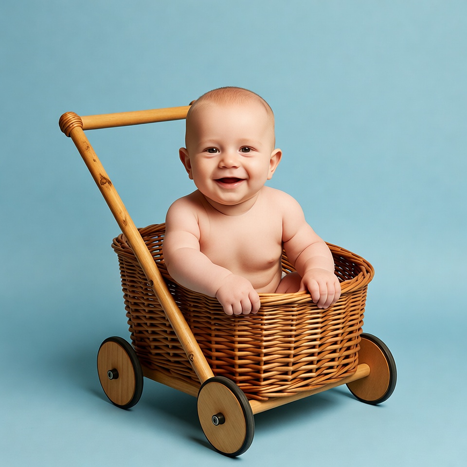 A happy baby with light hair sits naked in a wooden wicker baby walker on a blue background. The baby grips the handlebars and smiles broadly at the camera. The walker has wheels and a basket-like seat.