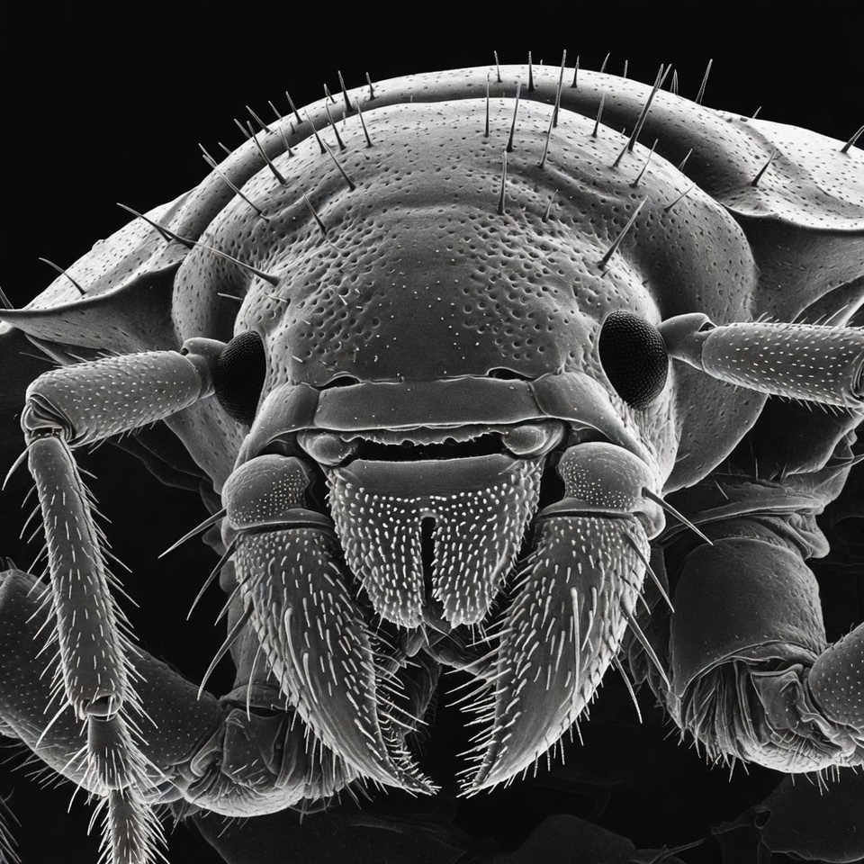 SEM, antennae, arthropod, black background, bug, close-up, compound eyes, detailed, electron microscope, exoskeleton, head, insect, isolated background, legs, macro, macro photography, mouthparts, pest, setae, texture, wildlife, silverfish