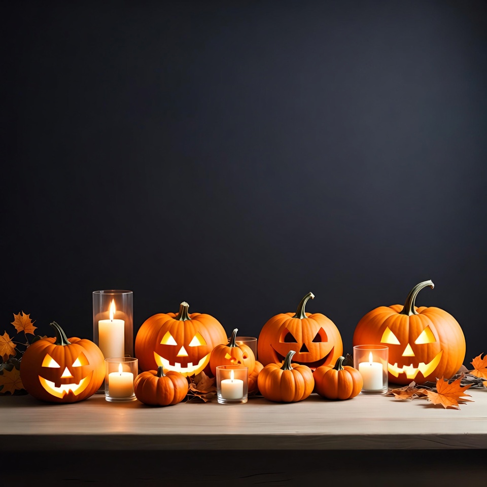 Several carved orange jack-o'-lantern pumpkins of varying sizes sit on a wooden table. White candles in glass holders illuminate the spooky carved faces. Autumn leaves and a dark background enhance the Halloween theme.