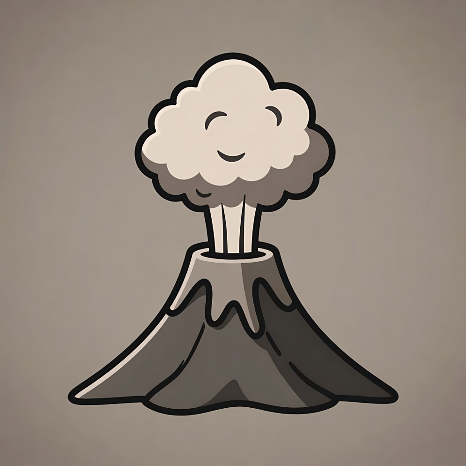 A cute cartoon volcano erupts with white smoke forming a smiling cloud on top. The volcano has a brown rocky base with dark gray slopes on a plain beige background. The illustration features bold black outlines and simple shapes.