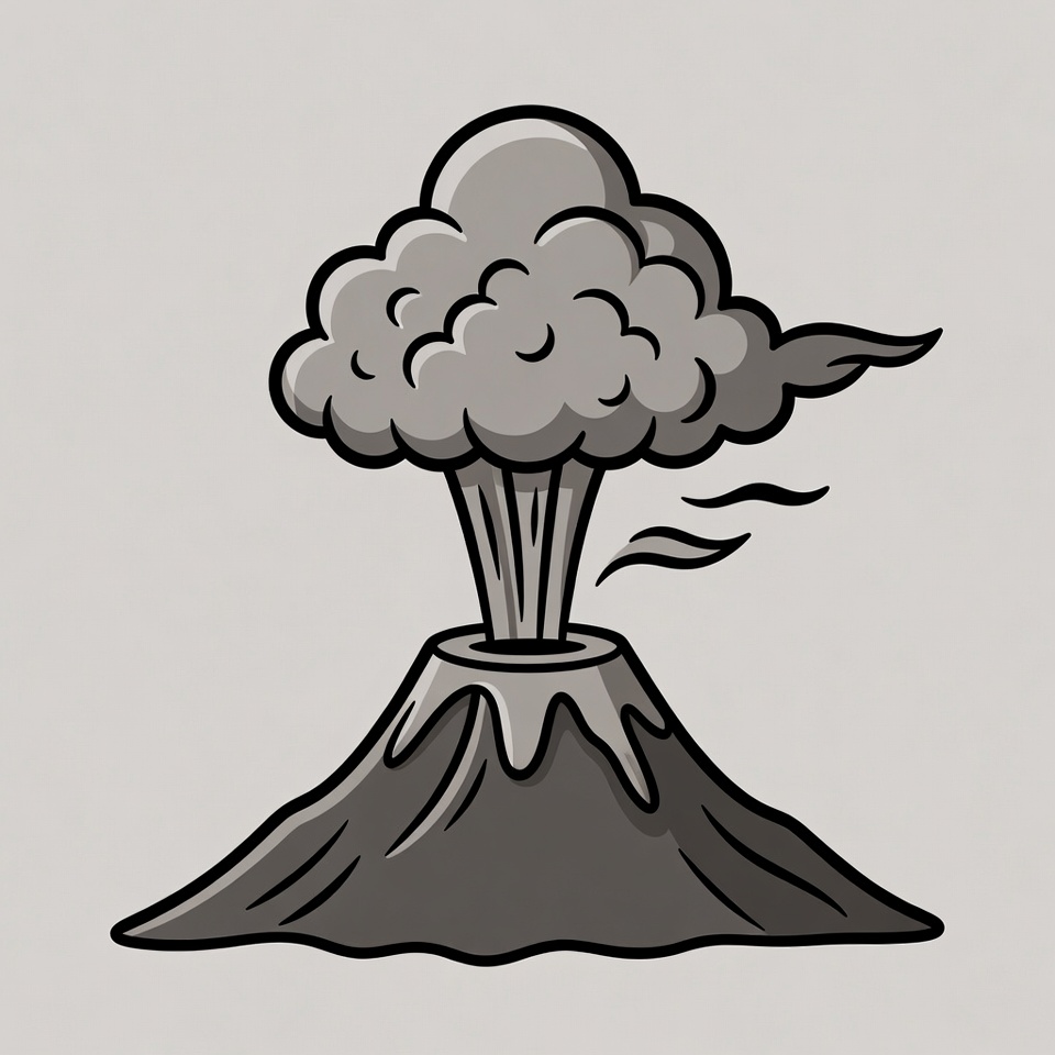 ash, black and white, cartoon, clipart, erupting volcano, eruption, gray, illustration, isolated background, lava, mountain, smoke, volcano