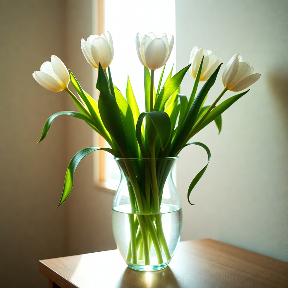 A bouquet of white tulips with long green stems stands in a clear glass vase filled with water. The vase is placed on a wooden table near a sunlit window. Sunlight streams through the window, illuminating the flowers and their vibrant green leaves.