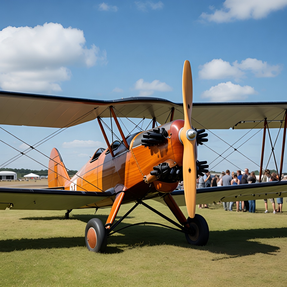 aircraft, airshow, aviation, bi-wing plane, blue sky, clouds, crowd, flying machine, grass airfield, men, orange biplane, outdoor event, people, propeller plane, retro plane, spectators, vintage airplane, women, wooden propeller, biplane