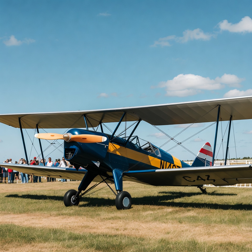 airshow, aviation, bi-wing plane, blue aircraft, clear sky, clouds, crowd, grassy airfield, open cockpit, people, propeller plane, red tail, registration N482CA, spectators, vintage airplane, wooden propeller, yellow stripes, biplane