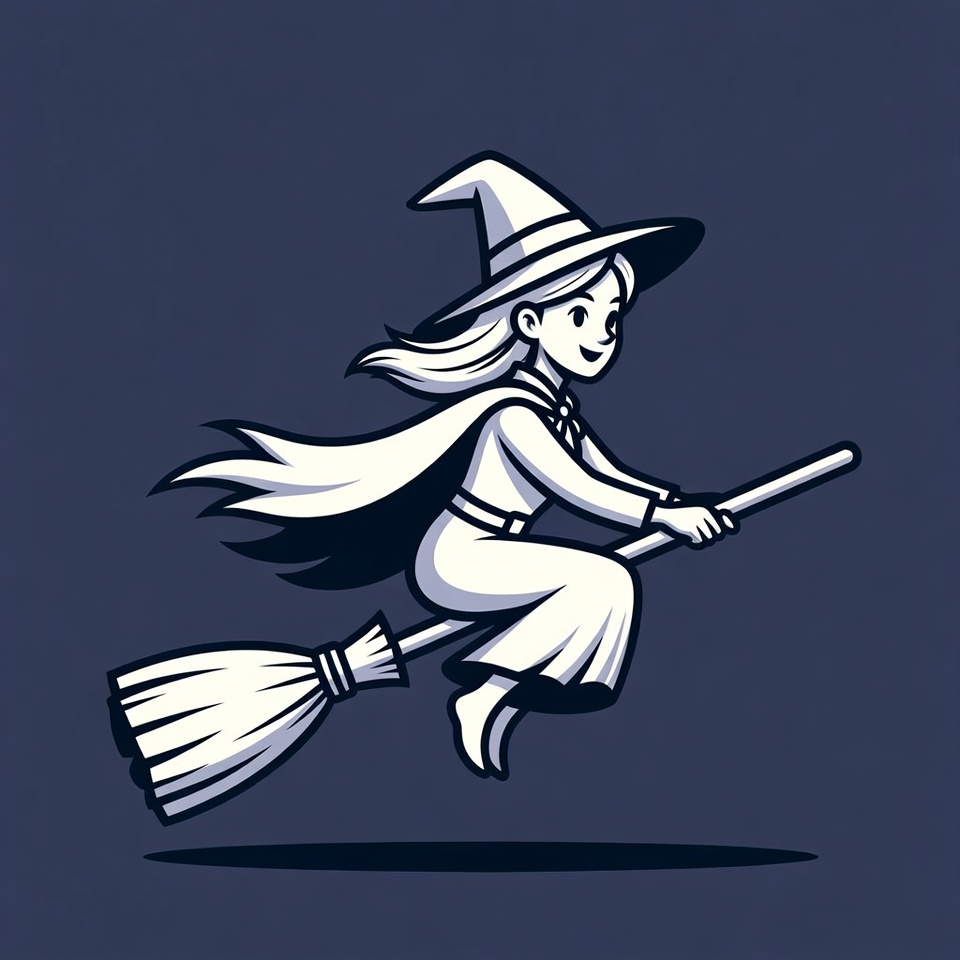 A cheerful cartoon witch with long blonde hair and a pointed hat flies on a broomstick. She wears a flowing white dress and cape, smiling happily with wind-swept hair. The illustration features a simple navy background with a shadow beneath her.