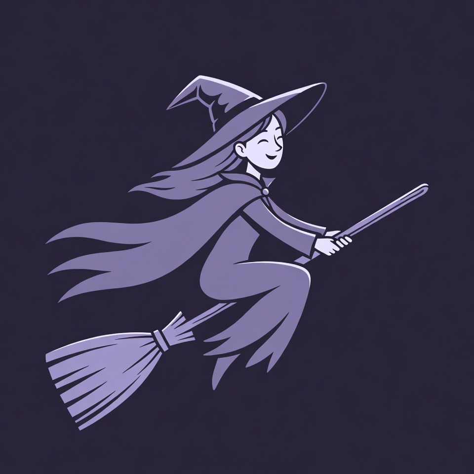 A smiling cartoon witch with long flowing hair flies on a broomstick against a dark purple background. She wears a wide-brimmed pointed hat, a long cape, and a dress that billows in the wind. Her broomstick has thick bristles at the end.
