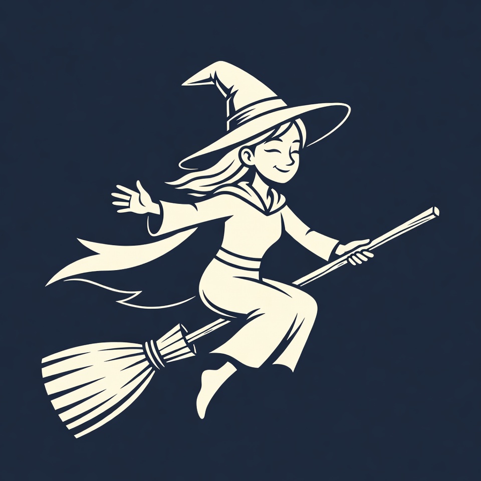 A cheerful cartoon witch with blonde hair and a pointed hat flies on a broomstick. She wears a flowing white dress with wide sleeves and smiles happily while extending one arm. The illustration is in white line art on a dark blue background.