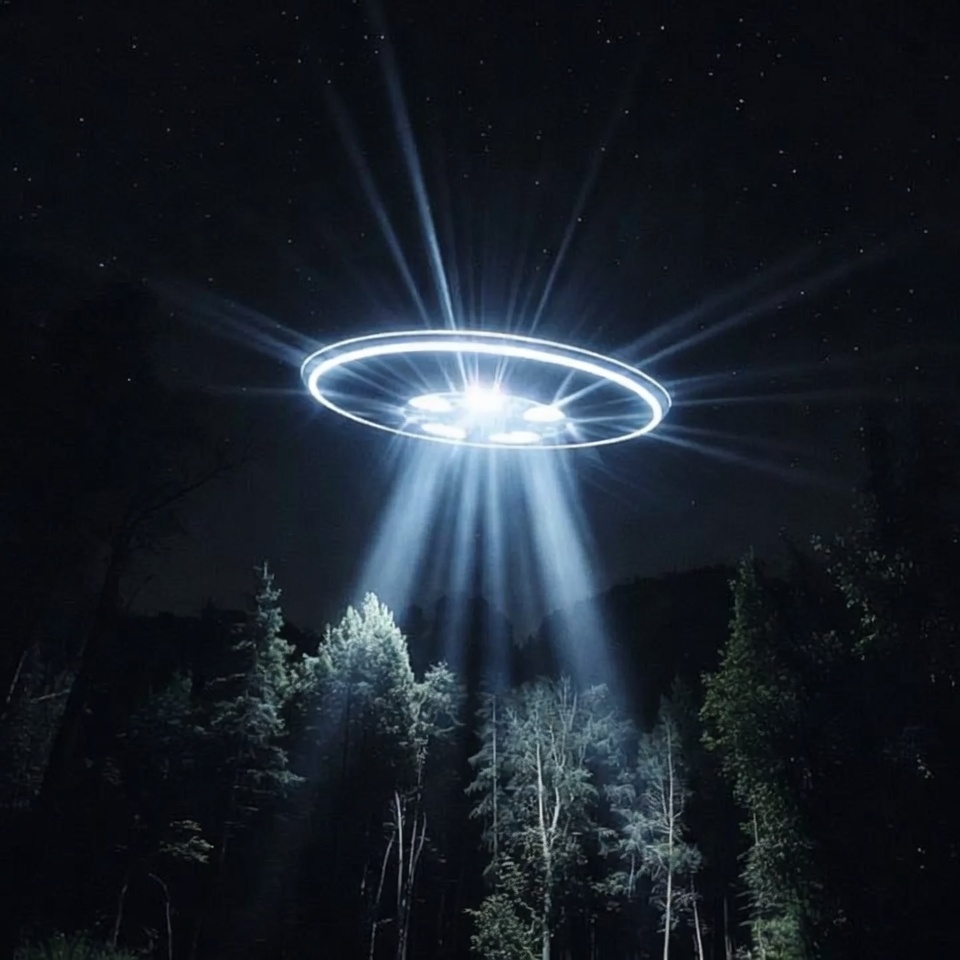 UFO beaming light over forest