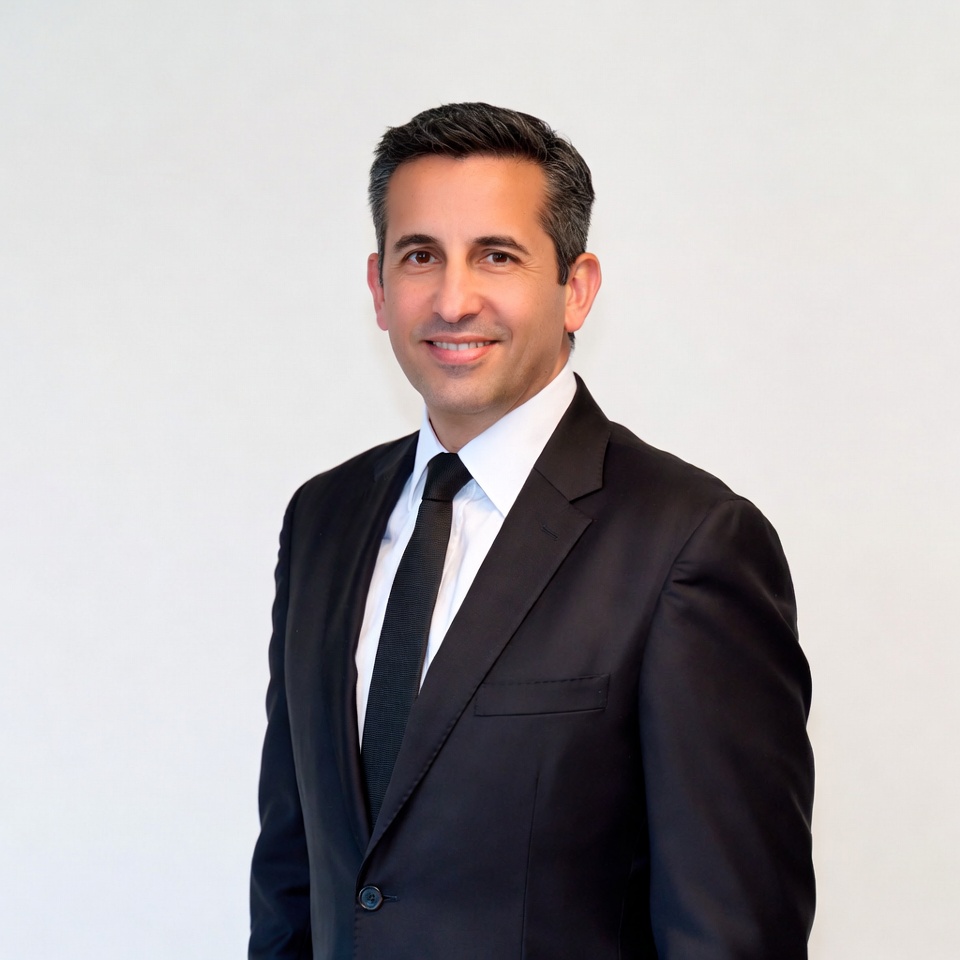 A Middle Eastern man with short graying hair stands smiling against a plain white background. He wears a black suit, white dress shirt, and black tie. His expression is confident and professional.