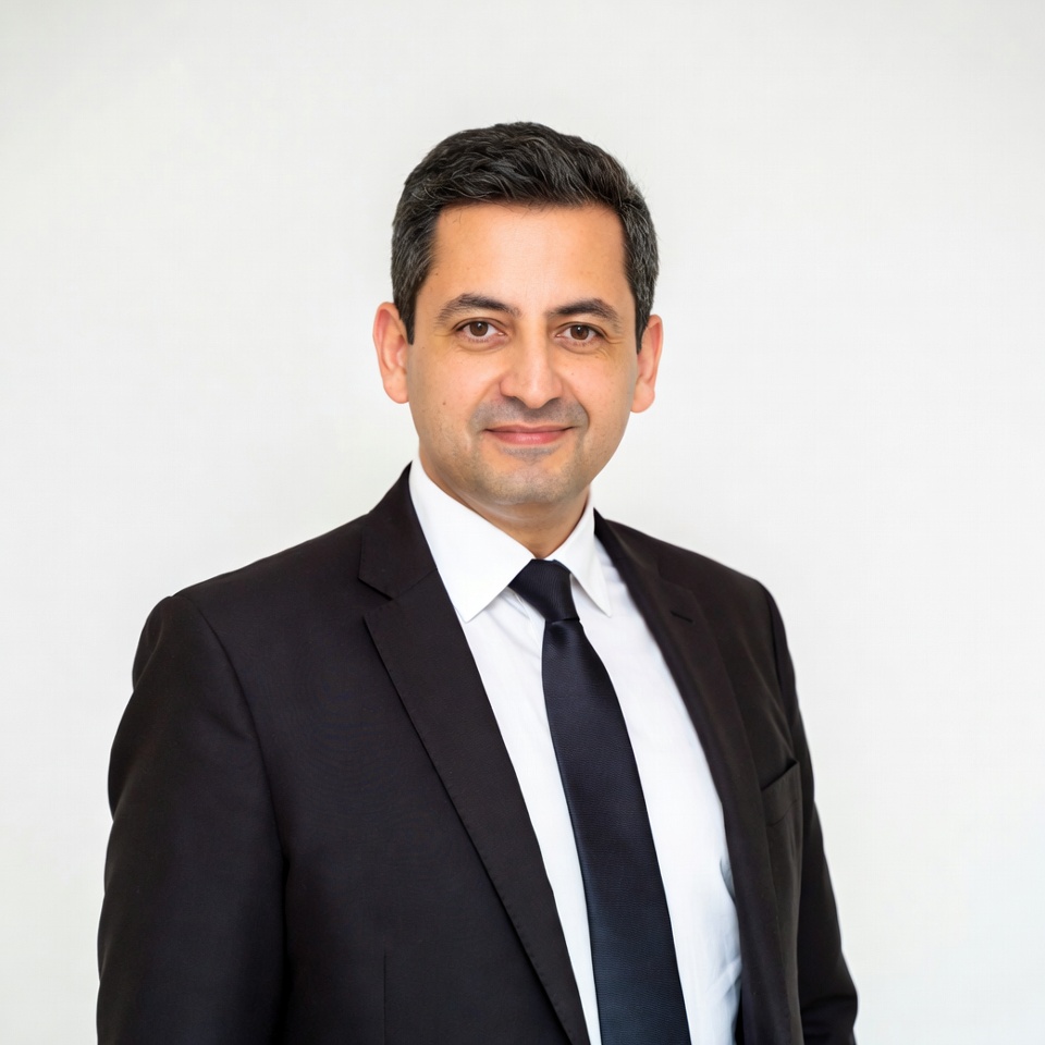 A Middle Eastern man with short graying black hair stands smiling against a white background. He wears a black suit jacket, white dress shirt, and black tie. His expression is professional and friendly.