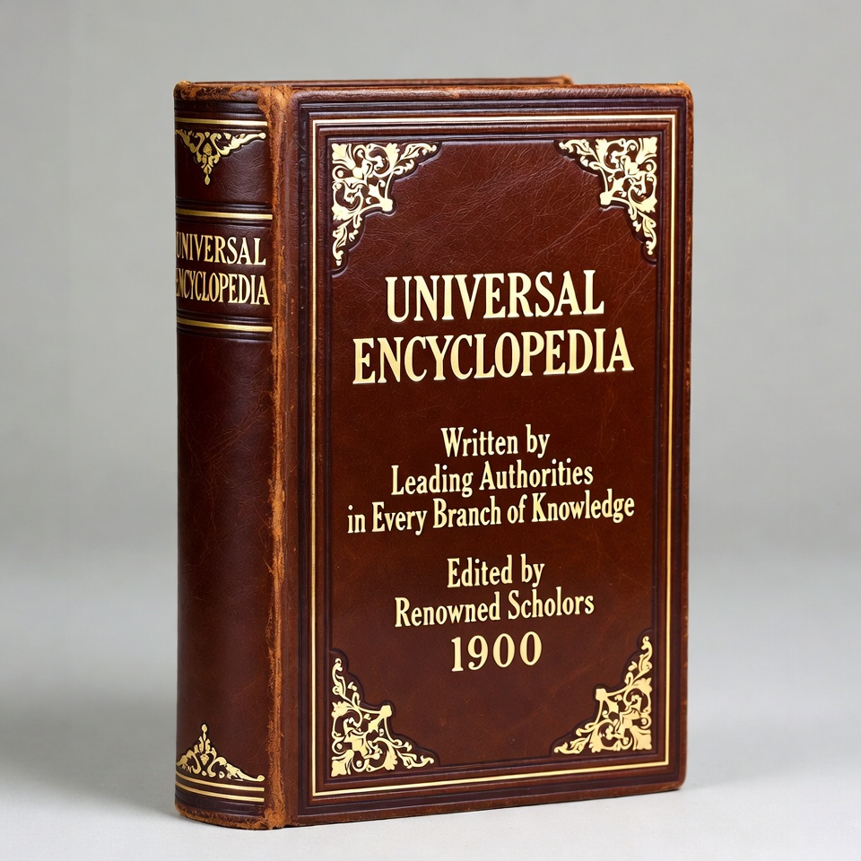 1900, antique encyclopedia, book, brown leather, cover, gold lettering, historical book, knowledge, leather bound, ornate design, reference book, scholarly, spine, universal encyclopedia, vintage, encyclopedia