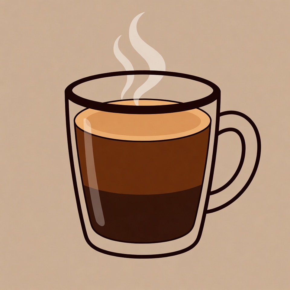 A clipart illustration shows a clear glass cup filled with layered espresso, featuring dark coffee at the bottom and lighter foam on top. Thin white steam rises from the hot beverage. The cup is centered on a beige background.