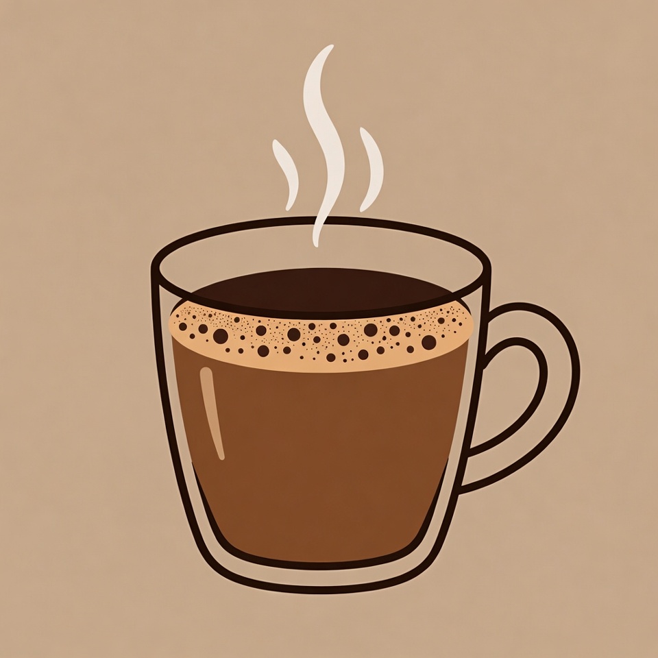 A simple illustration of a clear glass mug filled with hot brown coffee and foam on top. White steam rises from the surface against a beige background. The mug features a handle and detailed shading for a realistic look.