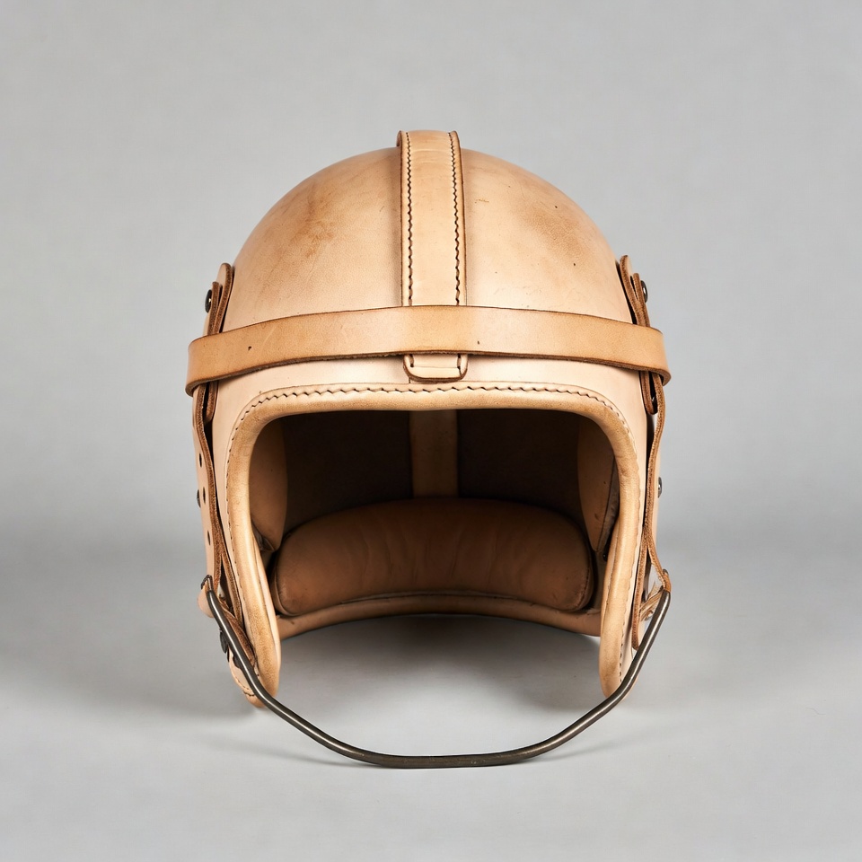 aged leather, american football, chin strap, football gear, helmet straps, isolated background, leather helmet, metal buckles, padded interior, protective gear, retro football, sports equipment, tan leather, vintage helmet, football helmet