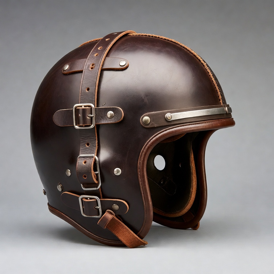 biker helmet, brown leather, chin strap, isolated background, leather straps, metal buckles, motorcycle helmet, open face helmet, retro helmet, rivets, vintage helmet, leather helmet