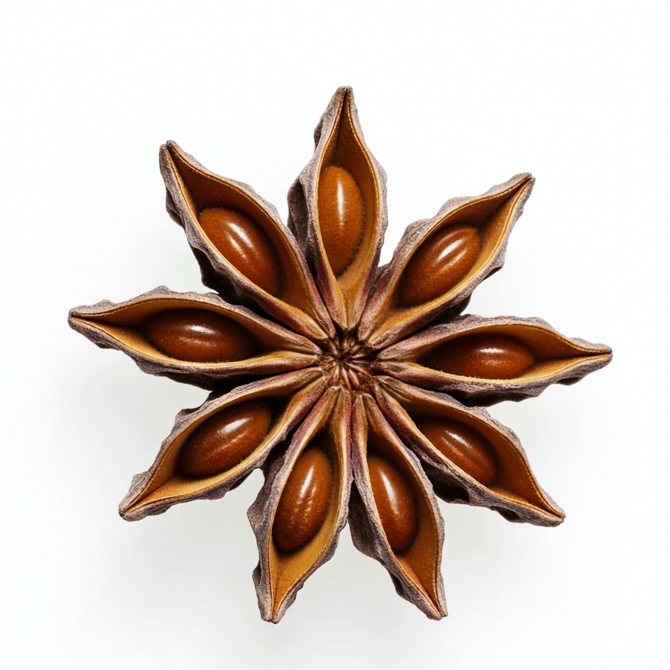 A whole star anise pod is displayed from above on a white background. The pod features eight pointed arms, each containing a single shiny brown seed. The spice has a symmetrical star shape with slightly textured, open pods.