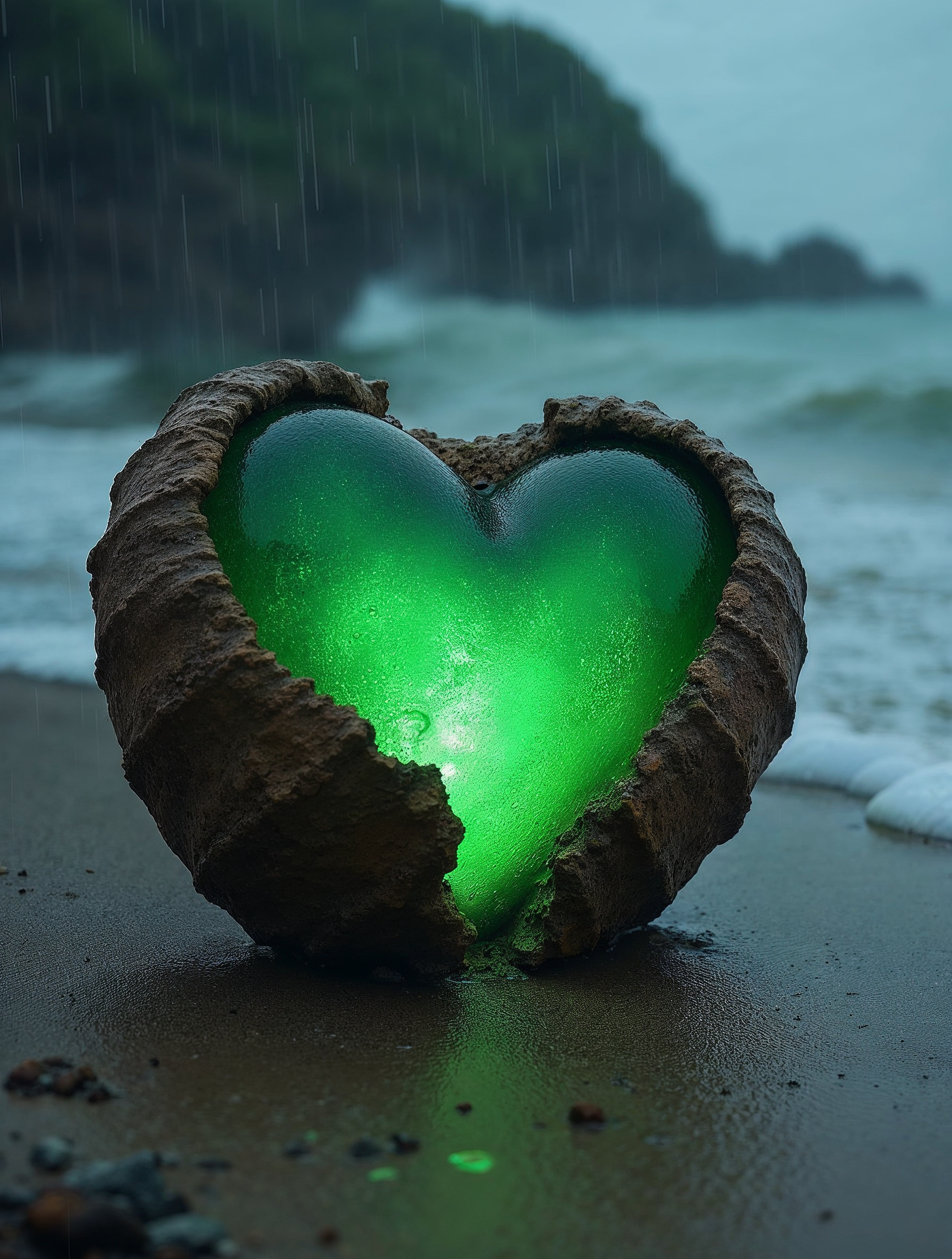beach, cliffs, crystal heart, fantasy art, glowing heart, green glow, heart shape, isolated background, nature, ocean waves, rain, sandy beach, seascape, shell heart, stormy weather, green heart