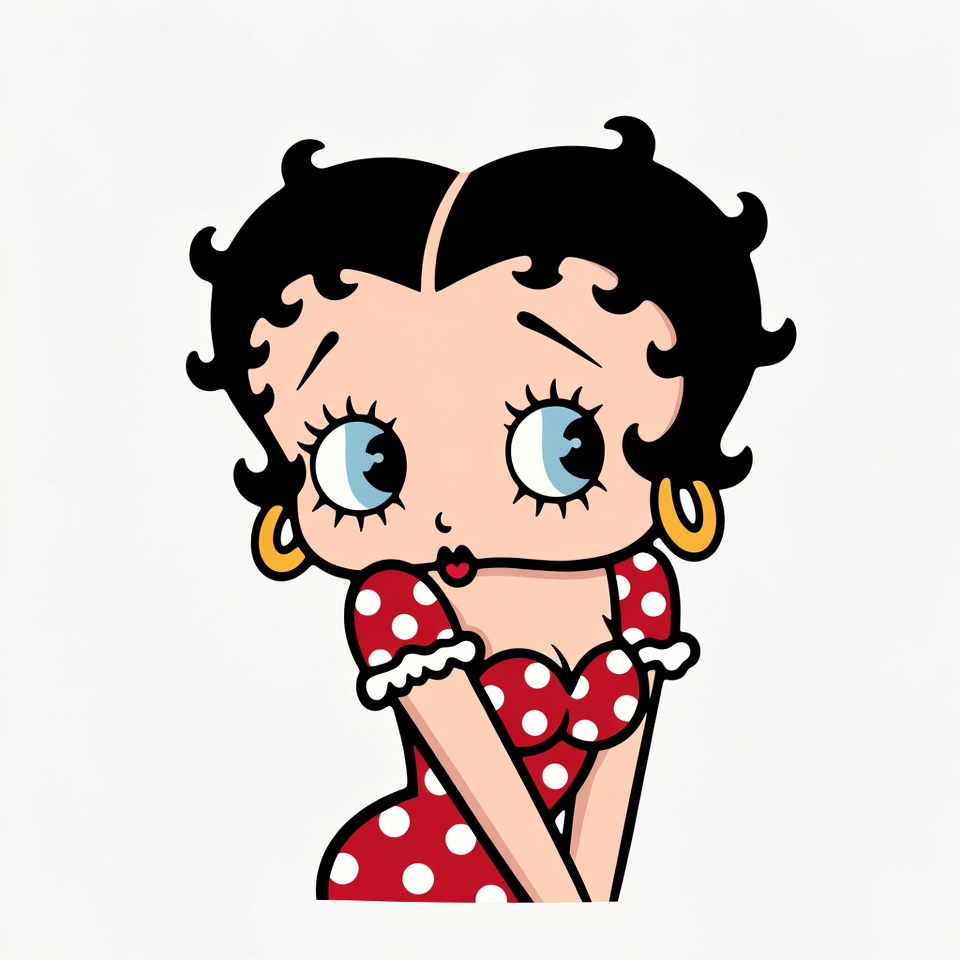 White, animated character, black hair, blue eyes, cartoon, clipart, curly hair, female character, gold earrings, illustration, isolated background, polka dot dress, puffed sleeves, red dress, sexy cartoon, smiling, vintage cartoon, winking, woman, Betty Boop