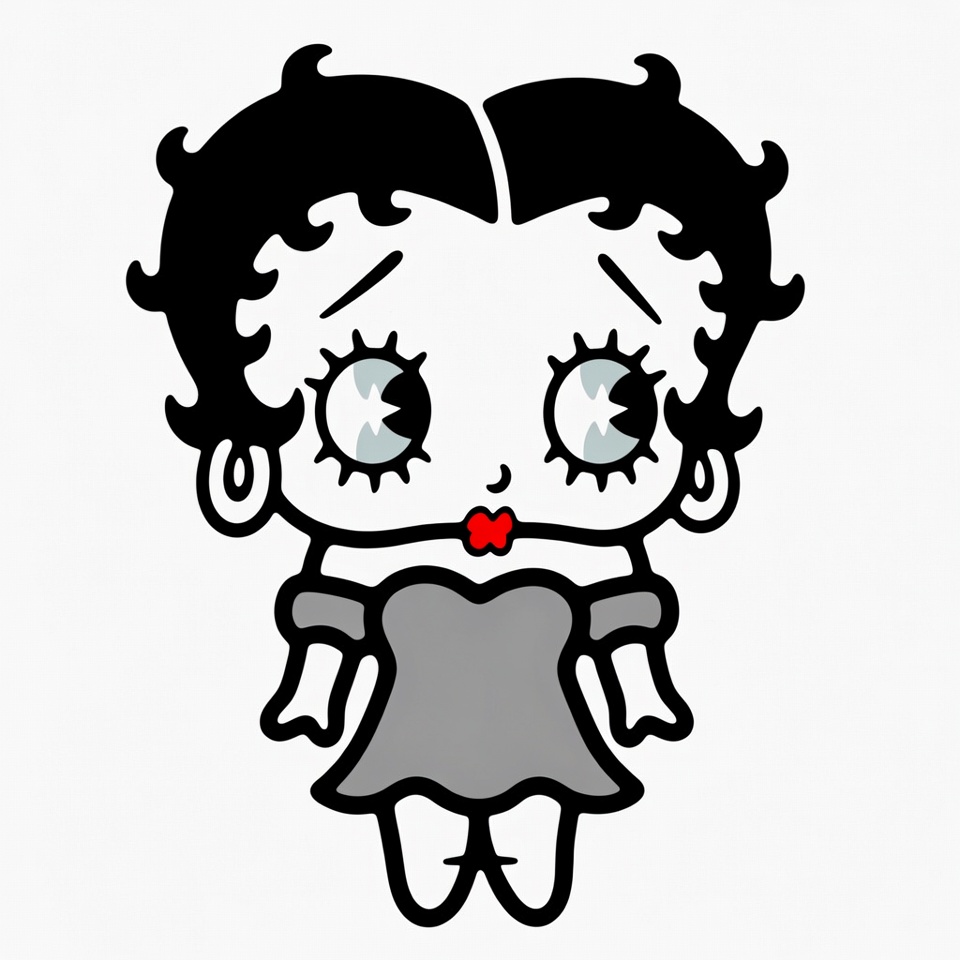 Black and white line drawing of Betty Boo with large expressive eyes and pouty red lips. She wears a gray dress with a curved hemline and stands on a plain background. The classic cartoon illustration features her signature curly black hair and cute facial expression.