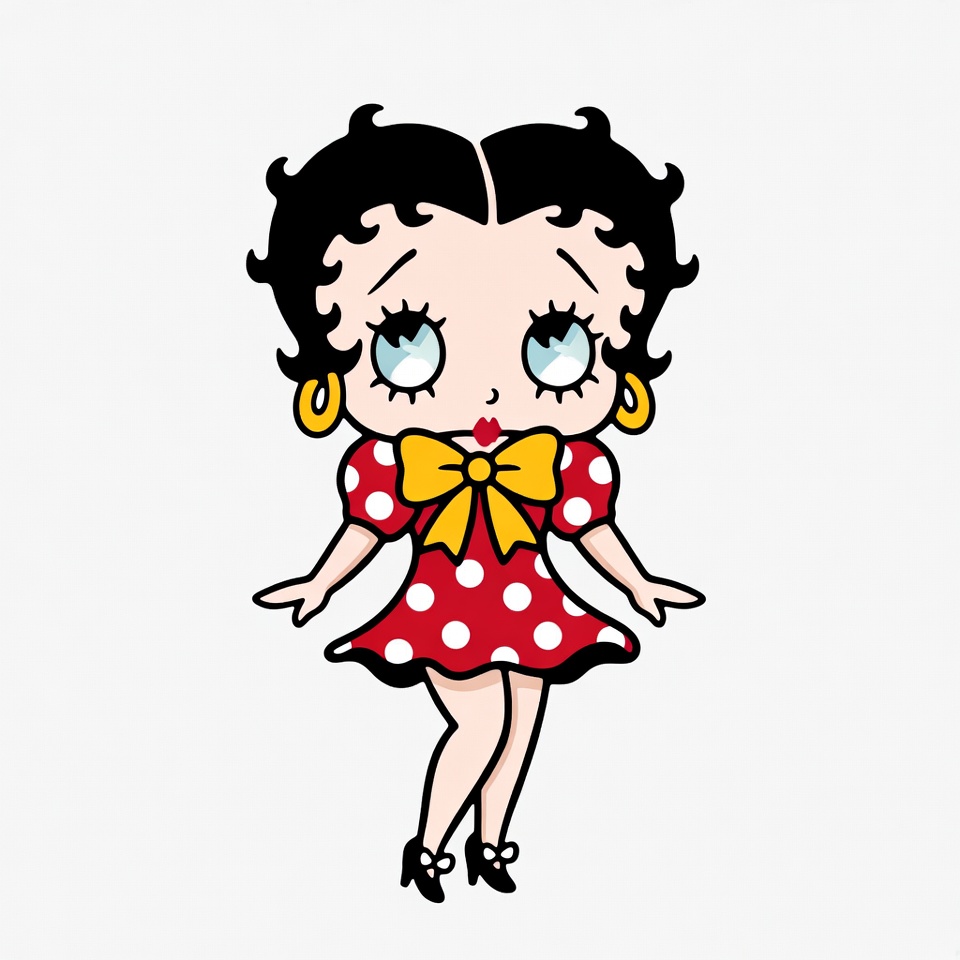 animated character, arms outstretched, black hair, blue eyes, bob haircut, cartoon, clipart, cute girl, female, gold earrings, high heels, illustration, isolated background, polka dots, red dress, retro illustration, standing pose, vintage cartoon, woman, yellow bow, Betty Boop