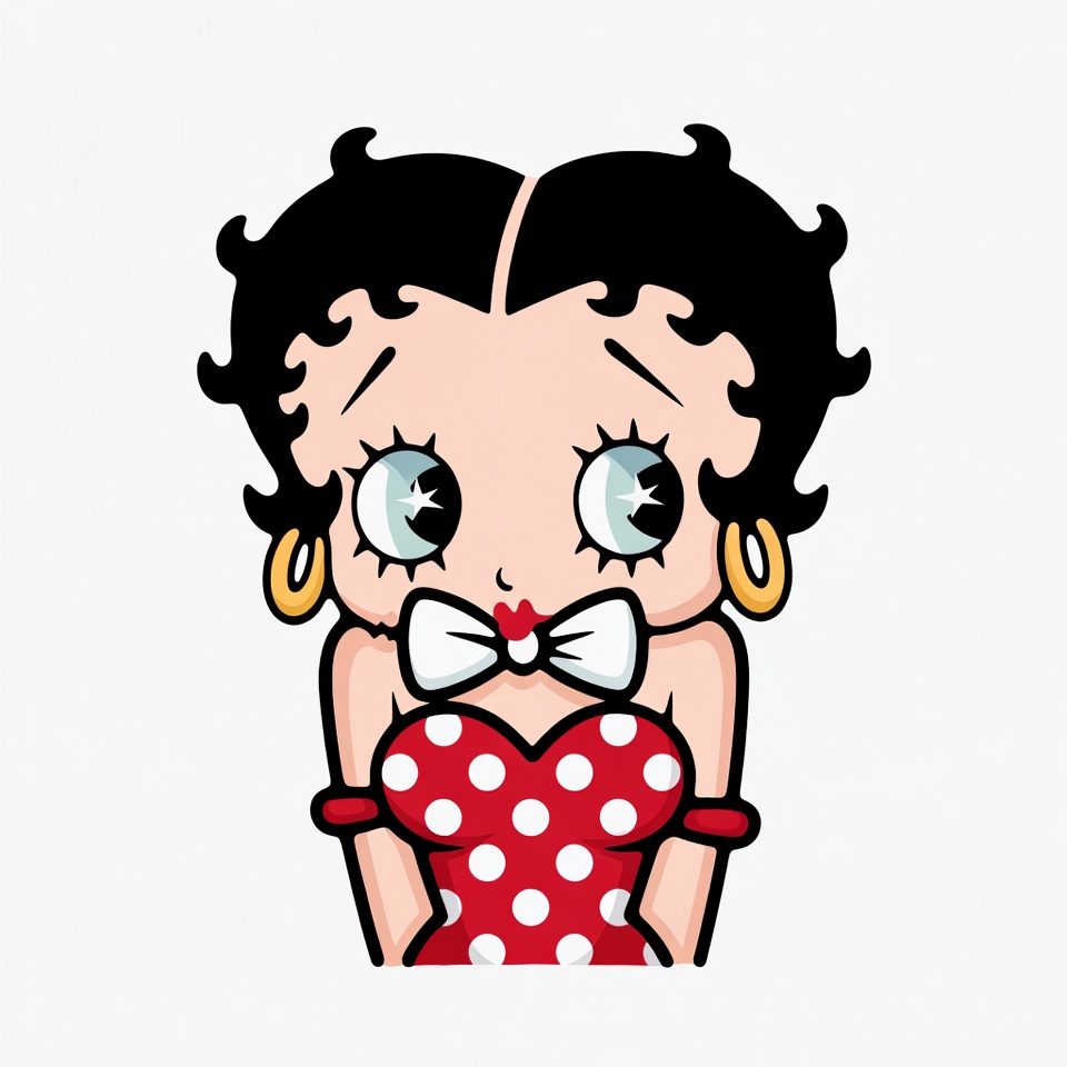 Black hair, animated character, big eyes, cartoon, clipart, curly hair, cute, female, gold earrings, illustration, isolated background, polka dot dress, red dress, smiling, vintage cartoon, white bow, woman, Betty Boop