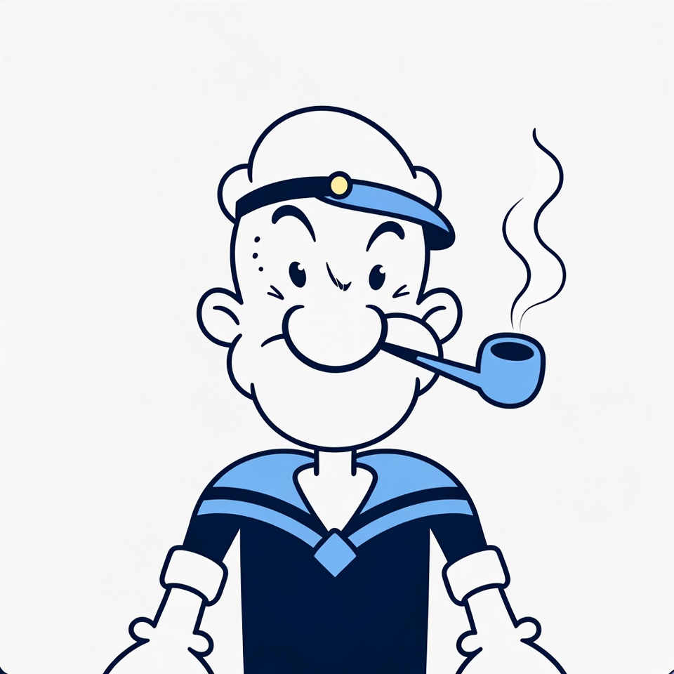 anchor, animated character, bald head, big chin, blue outfit, cartoon, clipart, illustration, isolated background, line art, nautical, pipe, sailor hat, sailor man, smoking, spinach sailor, squinting eyes, vintage cartoon, white background, Popeye