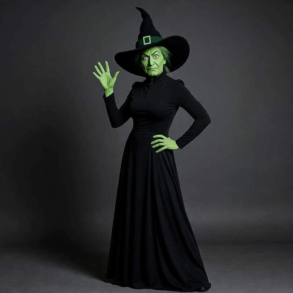 A woman dressed as the green-faced Wicked Witch of the West wears a tall black pointed hat, long black dress, and green gloves. She stands on a dark gray background with one hand raised in a wave and the other on her hip. Her face is painted green with a stern expression.