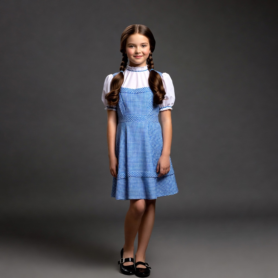 A young girl with brown hair in pigtails stands smiling on a gray background. She wears a blue gingham dress with puffed sleeves and a white collar, along with black Mary Jane shoes. Her outfit resembles Dorothy from The Wizard of Oz.