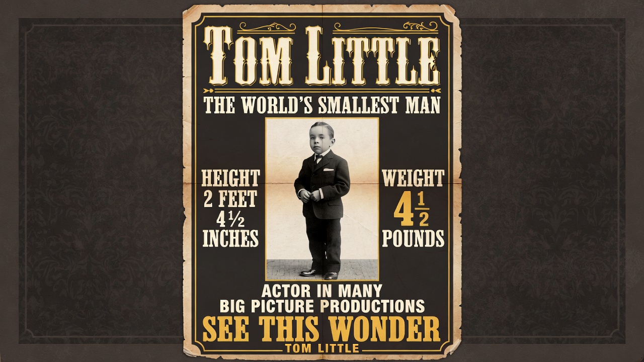 White, actor, big productions, circus poster, height 2 feet, illustration, isolated background, little person, male, smallest man, suit, tiny man, vintage poster, weight 4 pounds, world smallest, Tom Little