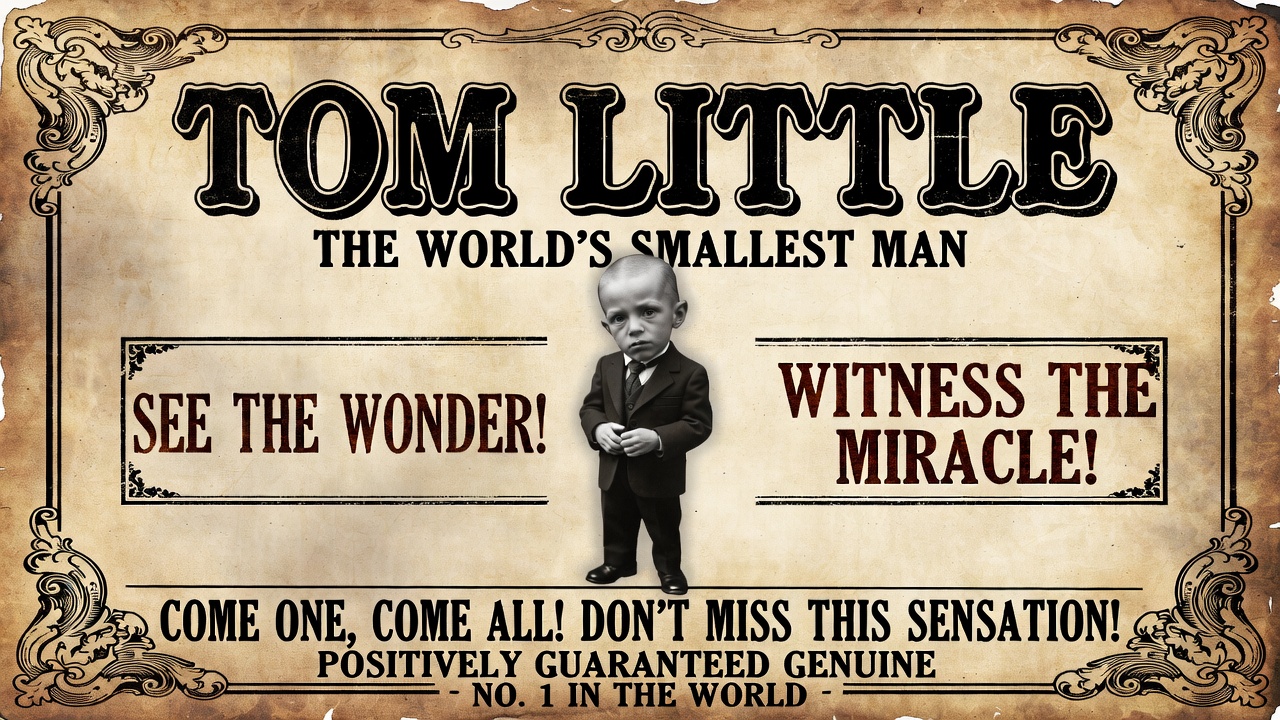Vintage-style circus poster advertises Tom Little as the world's smallest man. A tiny man in a suit stands confidently in the center, surrounded by ornate text proclaiming 'See the Wonder! Witness the Miracle!' The aged paper design features elaborate borders and promotional phrases like 'Come One, Come All!'