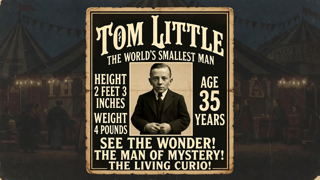 Vintage-style circus poster advertises Tom Little as the world's smallest man. It features a sepia-toned portrait of a small man in a suit with hands clasped, alongside text stating his height of 2 feet 3 inches, weight of 4 pounds, and age of 35 years. The poster has ornate borders, festive bunting, and bold lettering proclaiming 'See the Wonder! The Man of Mystery! The Living Curio!'