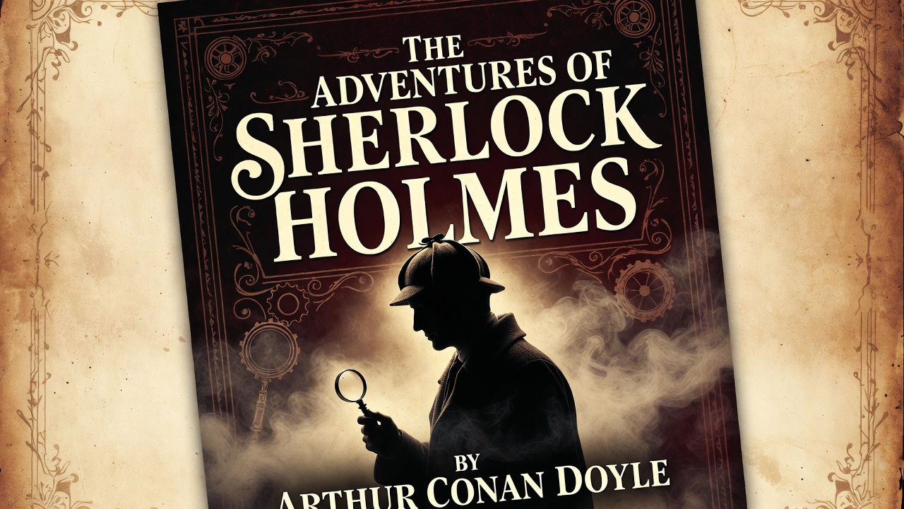 Vintage-style book cover titled 'The Adventures of Sherlock Holmes' by Arthur Conan Doyle features an ornate frame with aged paper texture. A silhouette of a man in a deerstalker hat holds a magnifying glass in the center. Dark foggy background and intricate border designs enhance the mysterious atmosphere.