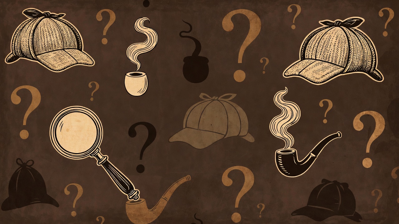 A sepia-toned illustration features a repeating pattern of Sherlock Holmes detective elements on a textured brown background. Items include deerstalker hats, magnifying glasses, curved pipes with smoke, question marks, and a coffee cup silhouette. The vintage line art style evokes mystery and investigation themes.