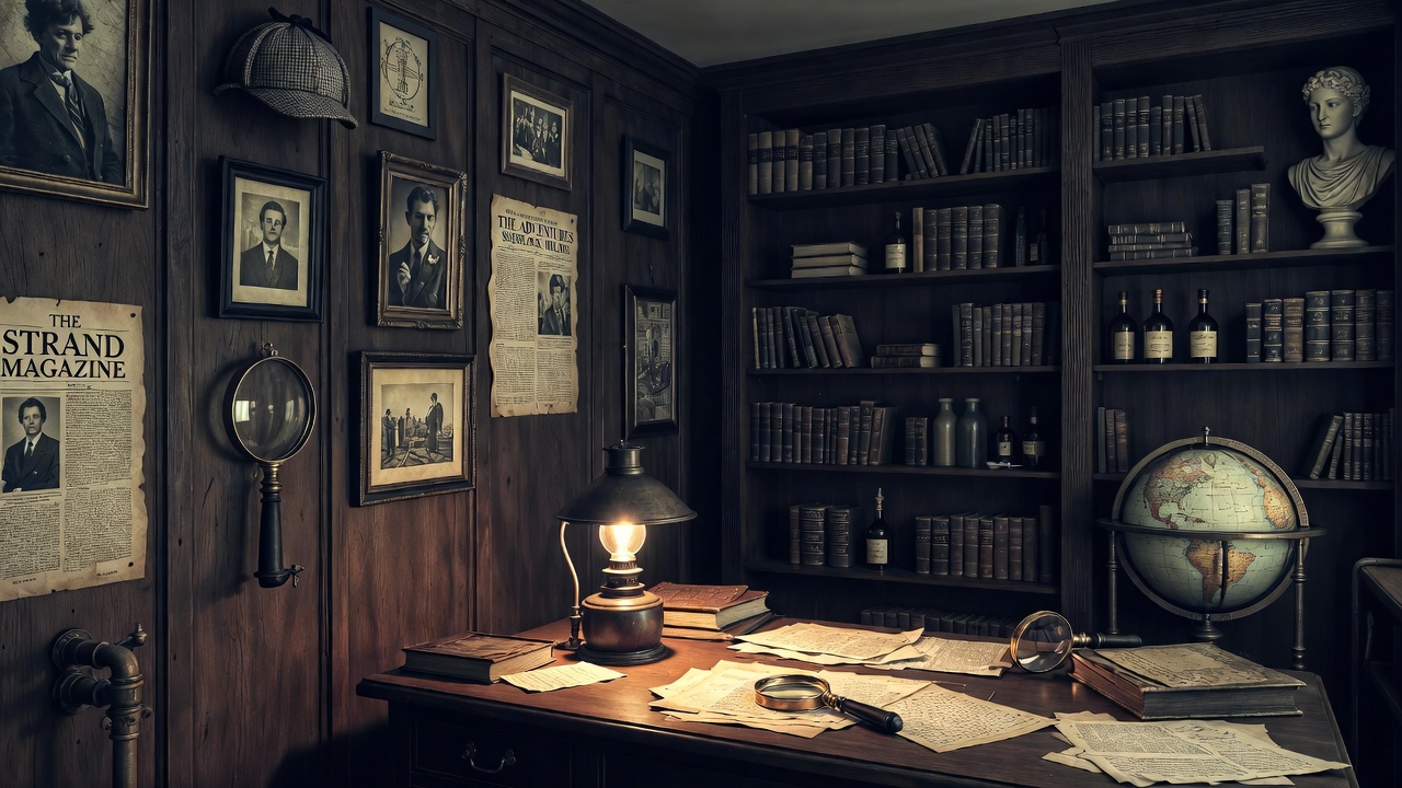 Sherlock Holmes, Strand magazine, Victorian interior, bookshelves, bottles, classical bust, cluttered desk, dark ambiance, deerstalker hat, framed portraits, globe, investigator study, isolated background, magnifying glass, mystery room, oil lamp, papers, photographs, study room, vintage books, vintage decor, wood paneling, wooden desk, detective office