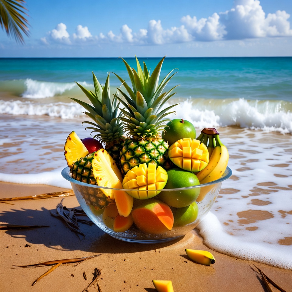 A large glass bowl filled with fresh tropical fruits including pineapple chunks, mango slices, bananas, oranges, and limes sits on sandy beach. Ocean waves crash nearby under a bright blue sky with scattered clouds. Palm leaves and banana peels are scattered around the bowl.