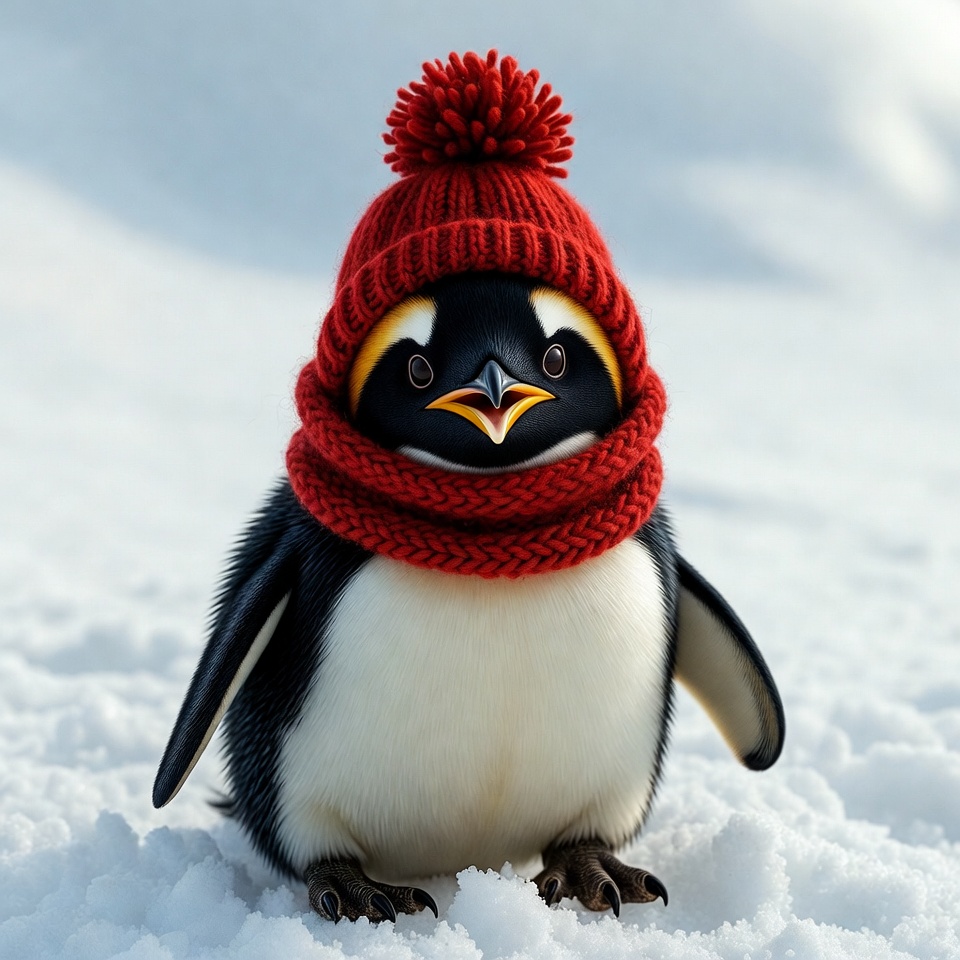 A cute cartoon penguin stands on snowy ground wearing a red knitted beanie with a large pom-pom and a matching red scarf. The penguin has yellow markings around its eyes and beak, with fluffy black and white feathers. It faces forward with a cheerful expression against a snowy white background.