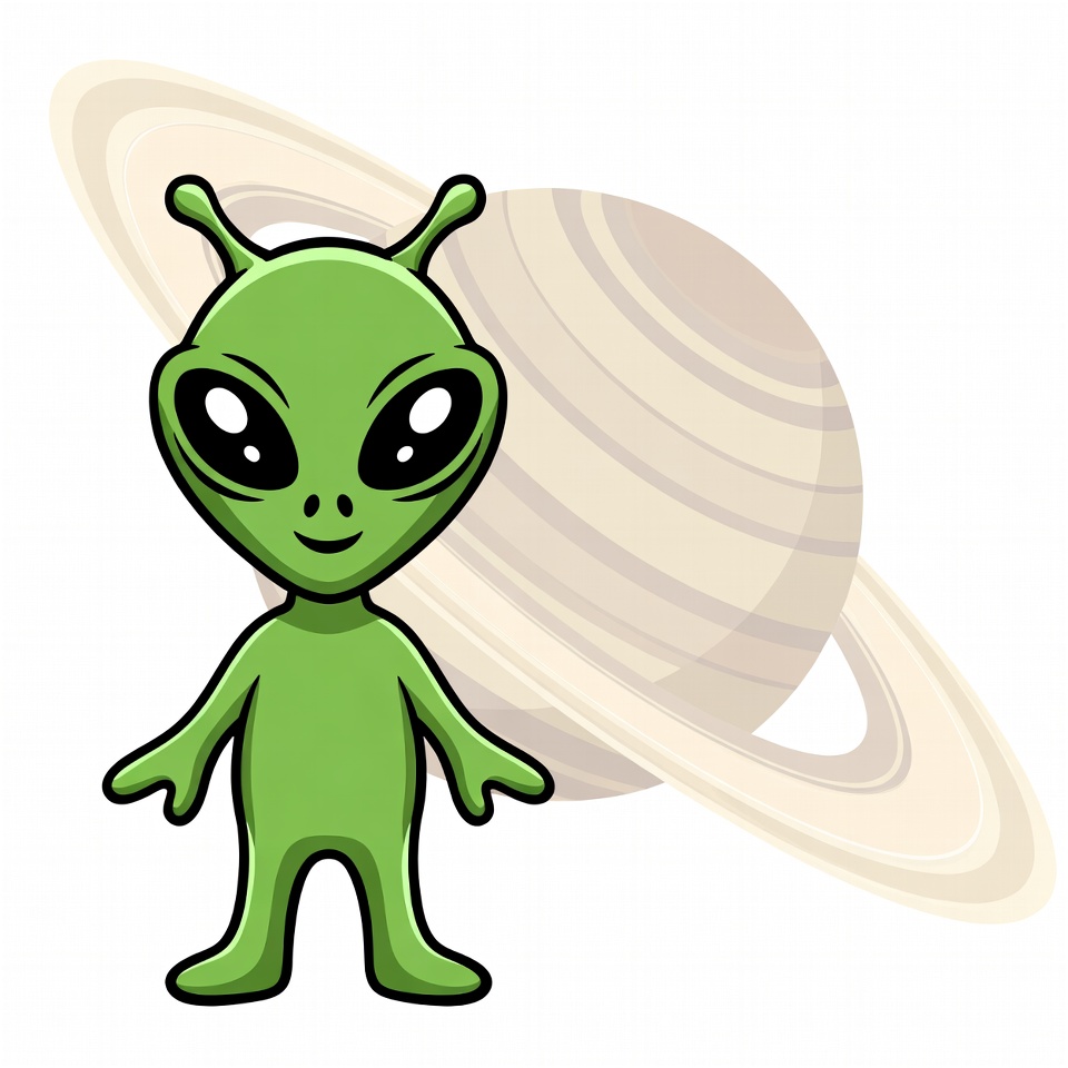 A cartoon green alien with large black eyes and antennae stands smiling with arms outstretched. A large ringed planet resembling Saturn is positioned in the background. The illustration features a white isolated background.
