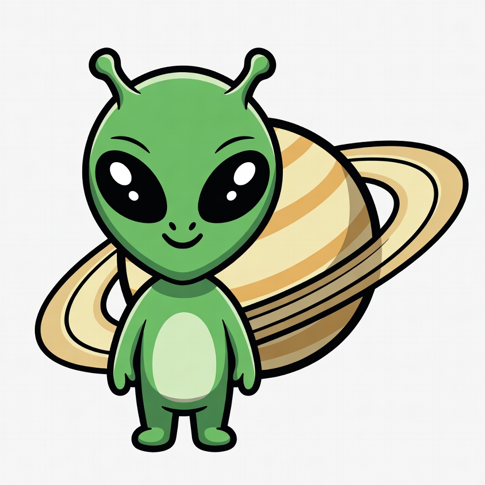 A cute cartoon green alien with antennae and big eyes stands smiling on a white background. A detailed Saturn with rings floats beside it. The illustration features vibrant colors and a friendly expression.