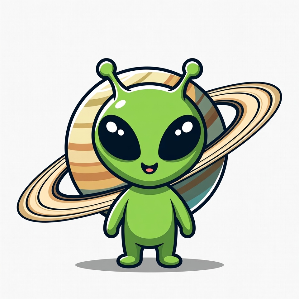 A cute cartoon green alien with large black eyes and antennae stands smiling in front of a large ringed planet resembling Saturn. The alien has a simple body with stubby arms and legs, set against a transparent background. The illustration features vibrant colors and a playful style.