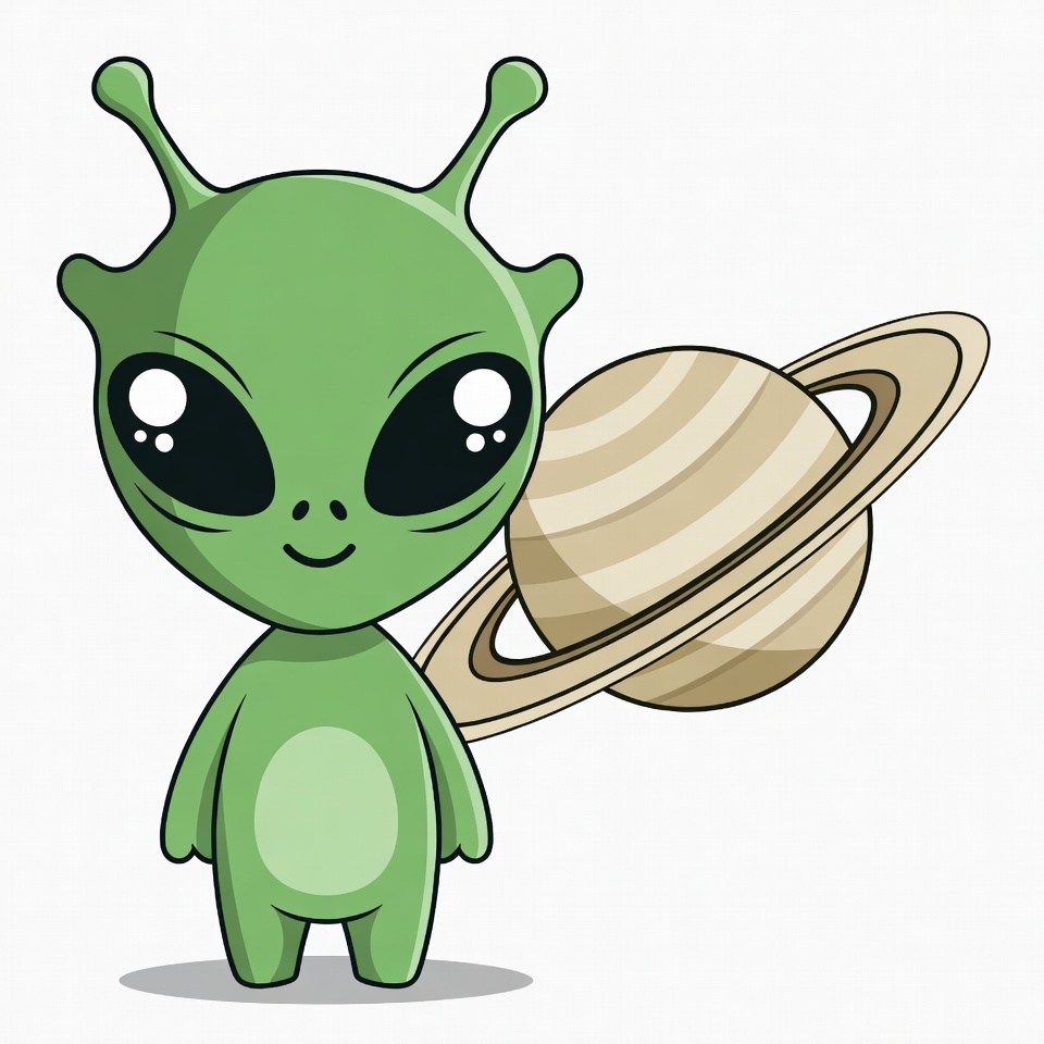 Saturn, Saturn planet, UFO, antennae, big eyes, cartoon alien, chibi, clipart, cute alien, extraterrestrial, green alien, illustration, isolated background, kawaii, planet, sci-fi, smiling alien, space, alien