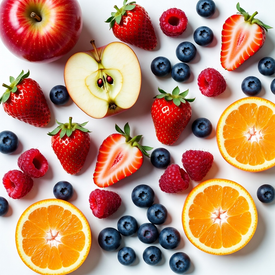 A vibrant assortment of fresh fruits arranged on a white background. Whole and sliced red apples, strawberries, raspberries, blueberries, and oranges are scattered artistically. Sliced apples and oranges reveal their juicy interiors.