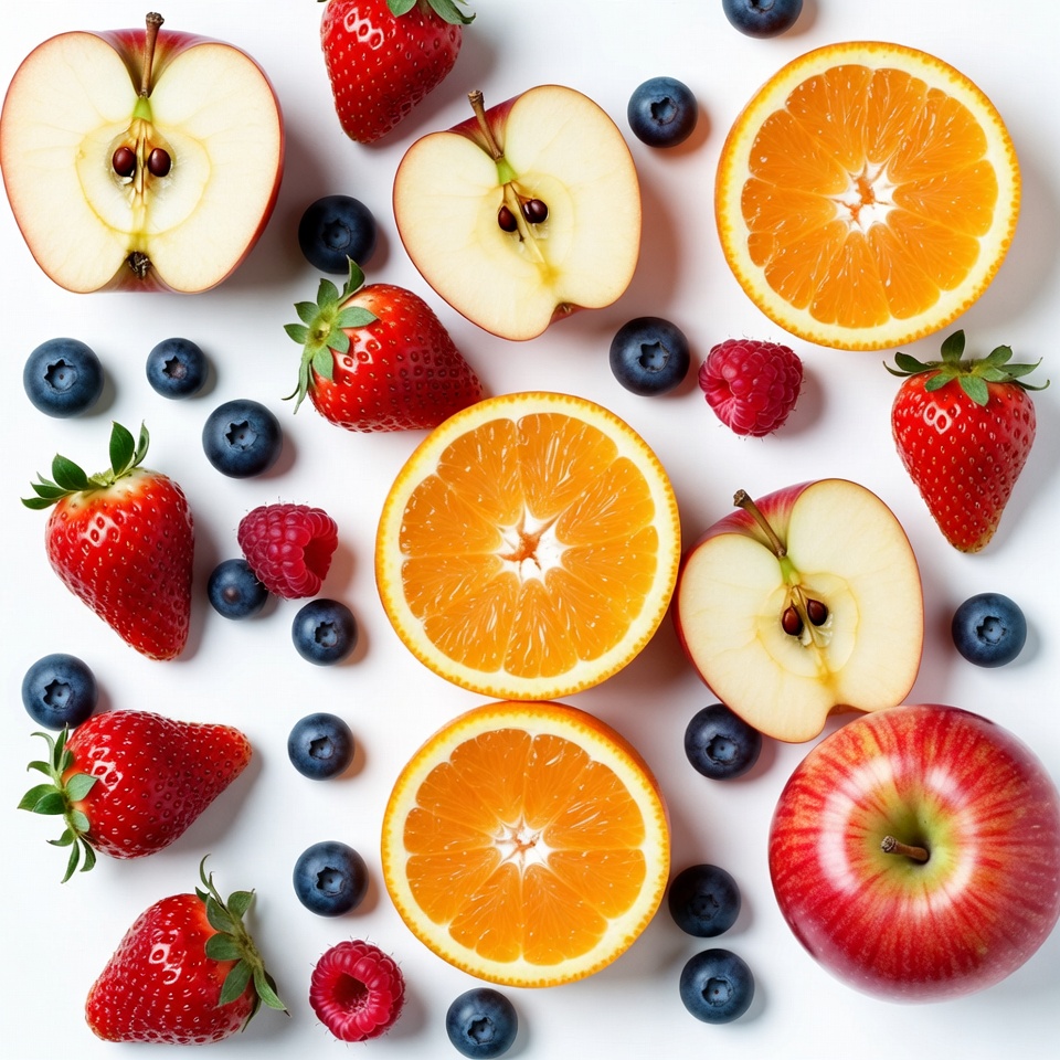 A flat lay arrangement of fresh fruits on a white background features sliced red apples, whole and halved strawberries, blueberries, raspberries, and orange wedges. The vibrant fruits are scattered casually, showcasing their juicy interiors and bright colors. No people or additional elements are present.