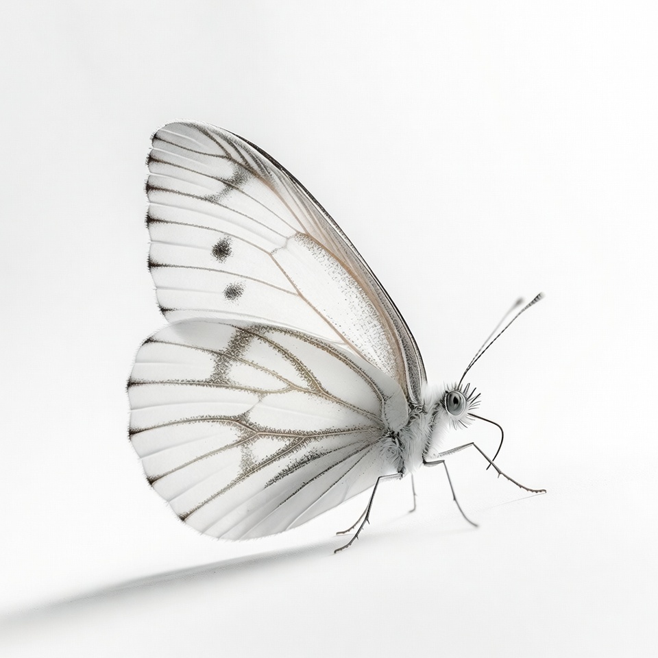 A delicate white butterfly with black spots on its wings is perched on a plain white background. Its wings feature intricate vein patterns and subtle translucent edges. Fine antennae extend from its head, and a soft shadow falls beneath it.