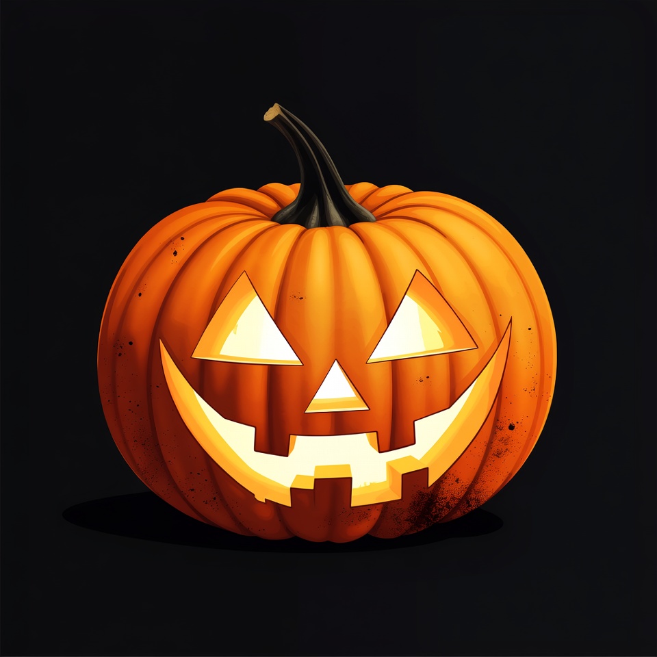 A carved jack-o'-lantern pumpkin with glowing orange triangular eyes, nose, and jagged smiling mouth sits on a black background. The pumpkin has a green-brown stem and textured orange skin with subtle shadows. It is a vibrant digital illustration isolated against the dark backdrop.