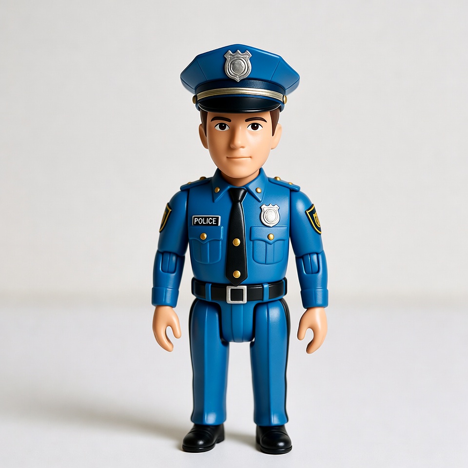 White, action figure, belt, blue uniform, figurine, illustration, isolated background, law enforcement, male, peaked cap, plastic toy, police badge, police cap, policeman, standing pose, tie, toy, uniform, police officer