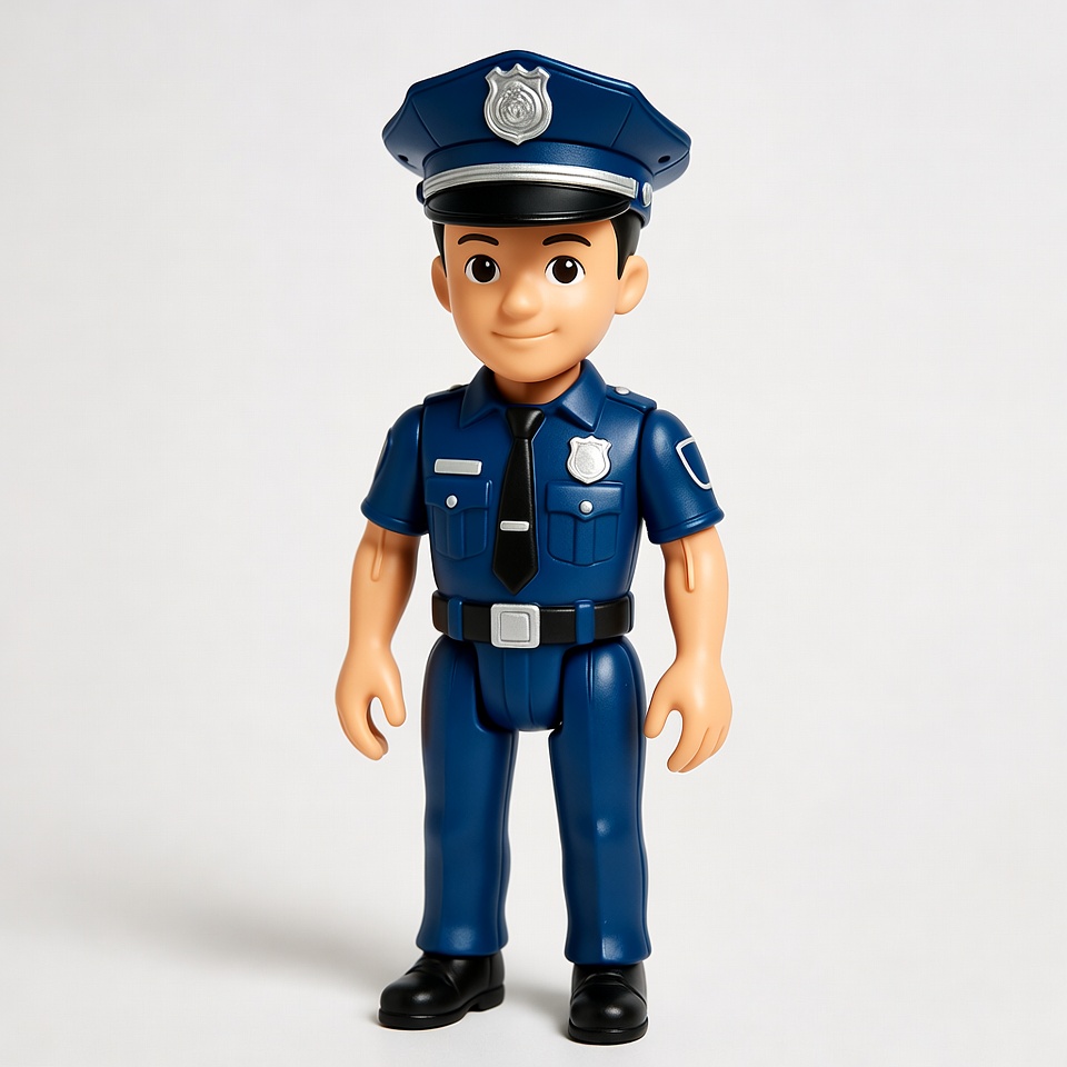 action figure, badge, blue uniform, boy, cap, cartoon, friendly face, hat, illustration, isolated, male, man, peaked cap, shoes, short sleeves, smiling, standing, tie, toy, uniform, white background, police officer