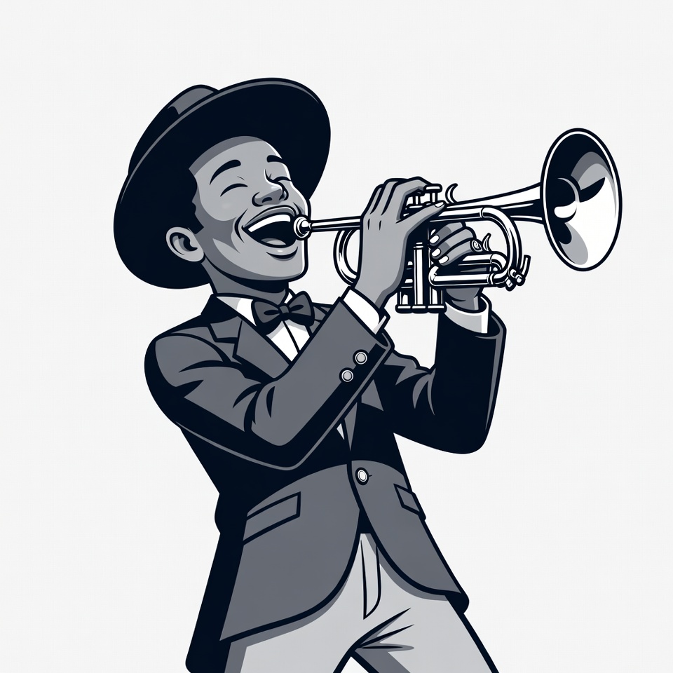 A Black man in a suit and hat plays a trumpet enthusiastically in a grayscale vector illustration. He wears a bow tie, tilts his head back with mouth open, and stands dynamically against an isolated white background. The style is bold line art with expressive facial features.